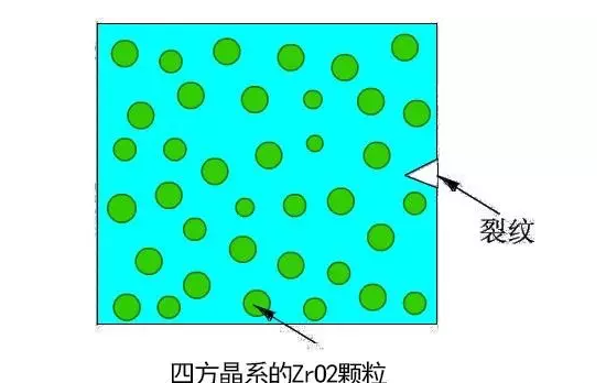 氧化鋯中四方相向單斜相的轉(zhuǎn)變可通過應(yīng)力誘發(fā)產(chǎn)生。當(dāng)材料受到外界拉應(yīng)力時(shí),基體對(duì)ZrO2的壓抑作用得到松弛,ZrO2顆粒即發(fā)生四方相到單斜相的轉(zhuǎn)變,這種相變將吸收能量而使裂紋尖端的應(yīng)力場松弛,增加裂紋擴(kuò)展阻力,從而大幅度提高陶瓷材料的韌性。