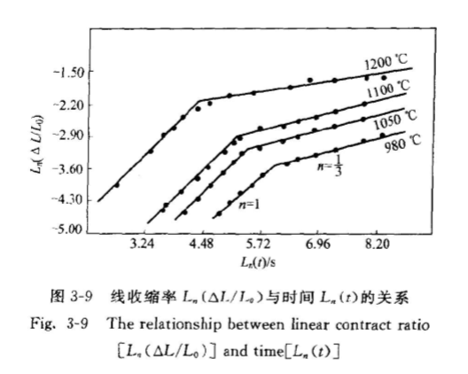 即線收縮率△L/La正比于時間t。根據普通粉體以擴散傳質為主的固相燒結模型,初期燒結的動力學關系為△L/ L=kt對于不同的擴散傳質機理,式中指數n取值在2.5~5之間變化。