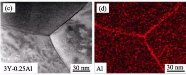 Al3+在晶界處均勻分布(左:3Y-0.25Al的晶界圖 右:Al3+的分布)