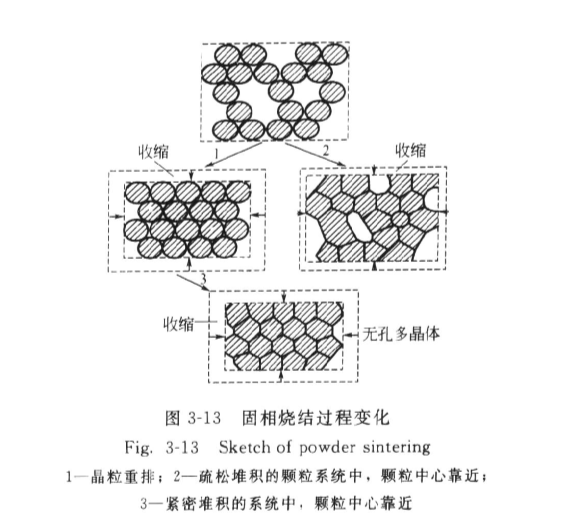 氧化鋯陶瓷制品在固相燒結過程中,會發生許多變化,圖3-13表示了固相燒結過程變化情況。在這些變化中,最主要的有:
